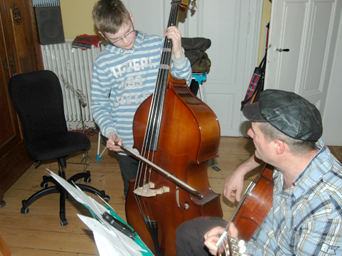 Los geht es für Anfänger mit „Pizzicato“, dem Zupfen der leeren Saiten. Ich spiele dazu Gitarre und recht schnell können bekannte einfache Lieder mit dem Kontrabass begleitet werden. Das macht Spaß und hilft dabei, die richtige Haltung zum Instrument zu finden sowie die Zupftechnik zu üben.